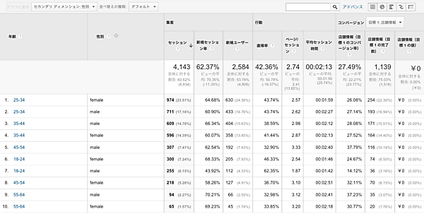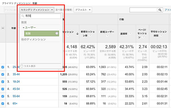 上画像に表示されている年齢に「セカンダリディメンション」という機能を使うことで、年齢に性別を掛け合わせて分析することができます。