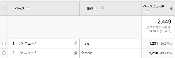 - 先ほどと同じようにセカンダリディメンションに性別を入力してページと性別を掛け合わせる