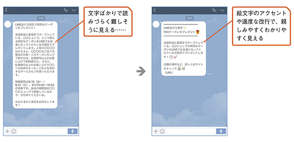 親近感や読みやすさを感じてもらうために重要なのが絵文字や顔文字です。性別や年代によってもよく使う絵文字や顔文字は異なるため、伝えたい相手にとってなじみがあるものを選んで使いましょう。また、絵文字であれば、アイコンや見出しを目立たせるような使い方もできます。