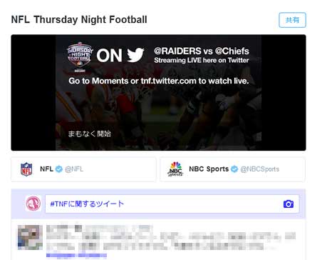 動画ではもう1つ、9月に米国でライブ動画を開始しました。木曜夜のNFLを無料ライブ中継するもので、Twitterのタイムライン上でNFLのゲームを楽しむことができます。米国発のサービスですが、日本でも視聴できます。