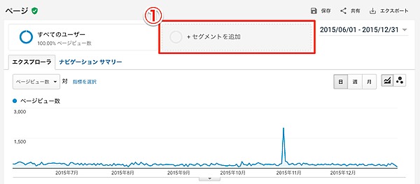 レポート画面の上の方にある「セグメント」をクリックします。