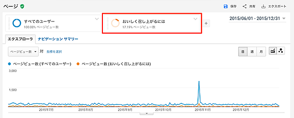「おいしく召しあがるには」を見たセッションのほうが、サイト全体のコンバージョン率よりも高いということがわかりますね。ということは、「おいしく召しあがるには」のページはサイト全体と比較し、成果に貢献しているページだと言えます。