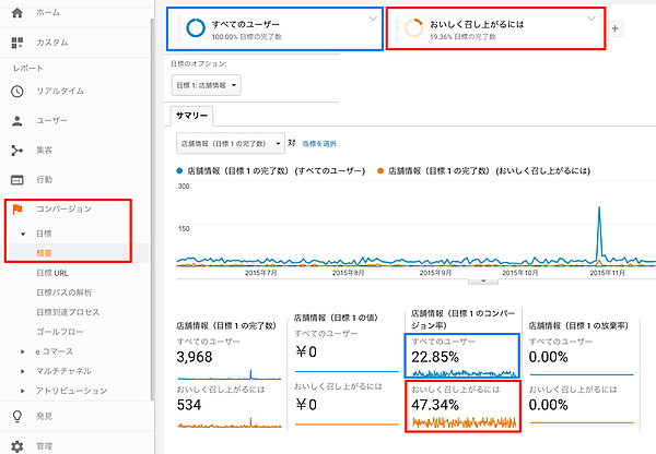 この状態で、「おいしく召しあがるには」を見たセッションと、すべてのセッションのコンバージョン率を比べてみましょう。