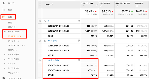ページビュー数、変化率をみると、改善する前の1週間(2015/5/19~2015/05/26)よりも、改善をした日から1週間(2015/05/27~2015/06/03)の方が増えていますね。