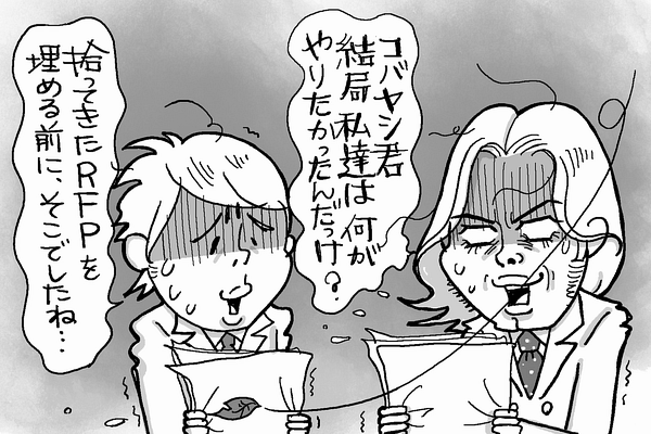 しかし、ここで社内事情のディスカッションを続けるのは、R社にも迷惑だ。サトウさんはR社に詫び、新たなRFPを配布することにしてこの場は引き取ってもらった。
