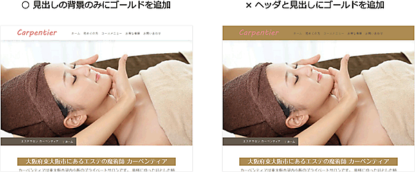 少量のゴールドを追加した例。ヘッダの背景のようなかたまりでは使わない方がよい。