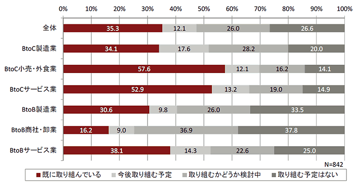 デジタルマーケティングに「すでに取り組んでいる」と答えた企業は全体で35.3%。取り組んでいる率が特に高かったのはBtoCの小売・外食業(57.6%)とサービス業(52.9%)、そしてBtoBサービス業(38.1%)だった。これは先述の「ビジネスが変化している」と答えた1~3位と合致し、やはりデジタル化で業界が変化している業種はデジタルマーケティングを積極的に推進していることがわかる。