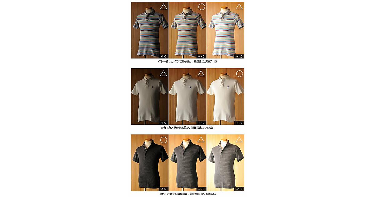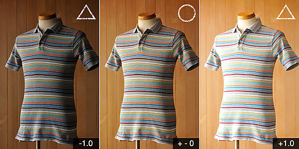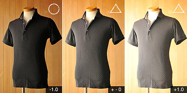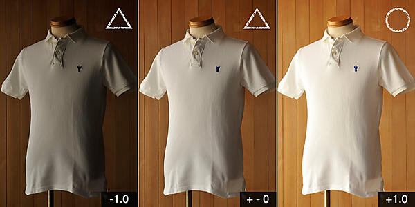 中段の白いポロシャツは、+1.0補正した画像が適正露出。