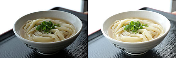 左の写真は、奥の窓から光が差し込むため、「麺」や「器」の手前に影が入っています。この原因は被写体の白さよりも、窓ガラスから入る強い光に影響を受けています。