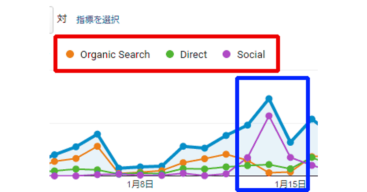すると図4のようにグラフに表示される折れ線が3本増える。先ほどチェックしたチャネルの「Organic Search」「Direct」「Social」、つまり「自然検索」「ノーリファラー」「ソーシャル ネットワーク」それぞれに対応したグラフが表示されている(図4赤枠部分)。これを見ると、1月14日のアクセス増は紫色、つまり「ソーシャル ネットワーク」からの利用が急増したことが明らかだ(図4青枠部分)。
