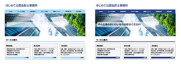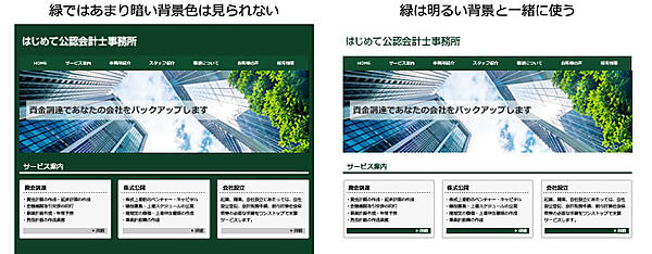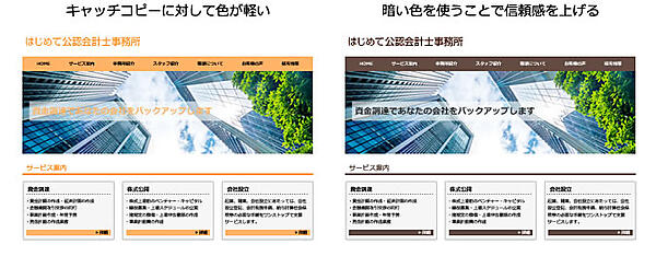 企業向けに特化したイメージを出したいのであれば、大きく暗い色を背景として配置することで、重厚で信頼できそうなイメージになりますが、明るい青を大きく敷くと派手で安っぽいイメージになり、画面も見づらくなってしまいます。