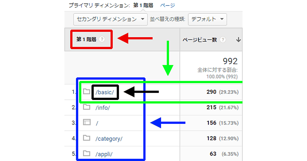 URLには階層があり、[行動]>[サイト コンテンツ]>[ディレクトリ]レポートでは、一番上の階層のディレクトリ(先述の例では「/directory1/」部分)が、「第1階層」ディメンション(図3赤枠部分)の値(図3青枠部分)として表示されている。