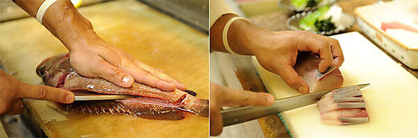長年の経験に培われた確かな技術、正確で無駄のない動き、新鮮な魚をアップで撮影しました。手や調理道具を入れることで、確かな腕を備えたスタッフが作っていることをアピールしています。