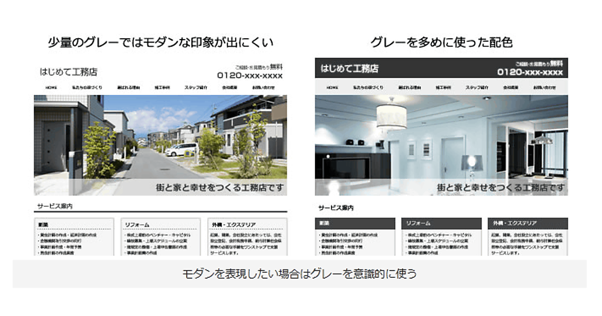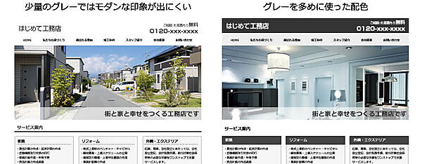ホームページ上では、多くの場合黒や暗いグレーは文字の色などで使われています。このようないつでも見えている色で、強い印象を与えたり、目立たせることは難しく、なかなかモダンな印象にはなりません。そこで意識して大きめに黒やグレーを配置します。