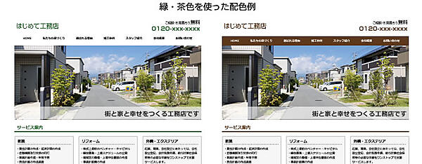 メインとなる1色を決めているのであれば、緑や茶のような色で自然でくつろげる家の印象や安心感などの会社のイメージを伝えることができますし、建物の写真を合わせることで伝えたい印象をより明確にすることができます。家の外観や内装の写真などには床の木・壁・家具などの様々な色が入ってくるため、決まっている色が1色であったとしても単調な配色にはなりません。