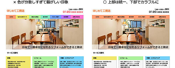 写真ともう1色くらいだと少しさみしいように感じられるかもしれませんが、写真がきれいであれば大丈夫です。新築やリフォームなどのそれなりの金額を扱う業種です。写真は必ずプロに依頼するようにしましょう。いかに多くの写真があっても、その質が低ければ印象も正しく伝わりませんし、サービスの魅力も半減してしまいます。