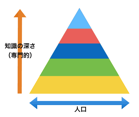 一般的にある情報について「知識の深さ」と「人口」の関係は、次のピラミッドのように表されます(情報配信ピラミッド)。