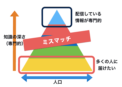 多くの人に情報を届けたいのに、自分にとっての当たり前が深まり、専門的になっていることに気づかないまま情報配信を続けて「どうしてわかってくれないんだ」というジレンマに陥っているとしたら、このミスマッチが原因です。
