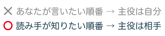 “あなたが言いたい順番”で文章を構成するのではなく、“どういう順番で、読み手が知りたい(読みたい)のか”という「視点の反転」を文章に取り入れましょう。