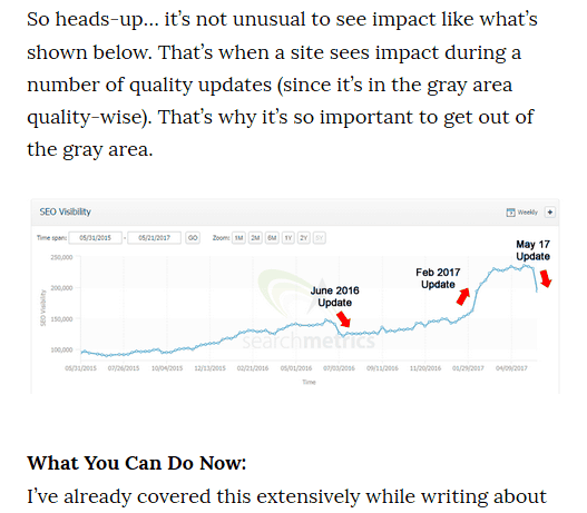 (順位が下がった場合は)おそらくすぐには回復できない。本当に品質が改善したとグーグルが認識するまでには長い時間がかかる。いまのSEOは短距離走ではなくマラソンの心構えで取り組んでいくべし。