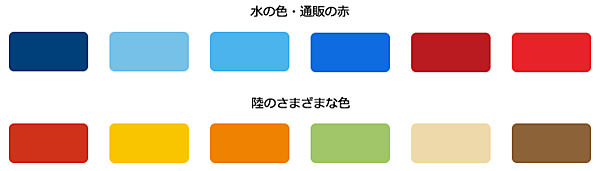 - 海・陸を連想させる1色と、目立たせる色の組み合わせで配色する