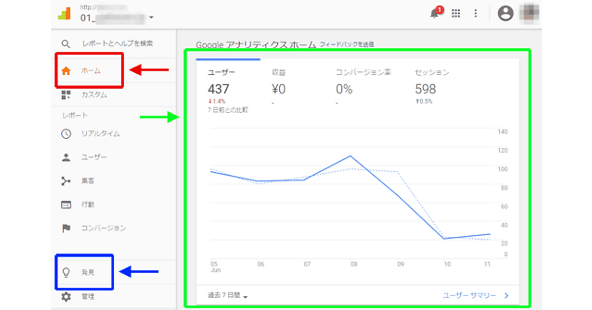 新しいインターフェースでは、ログイン後の画面が大きく変わった。図1がログイン後に表示される新しいホーム画面だ。画面左側のナビゲーションの上部に新しく「ホーム」(図1赤枠部分)が新設され、ここがログイン後に自動的に表示されることになる。また、左ナビゲーションの下部には新しく「発見」(図1青枠部分)も新設されている(詳しくはこの記事で後述)。