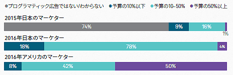 アメリカでは2013年当時、予算の半分以上をプログラマティック広告に投じるマーケターはわずか7%でした。それが、2015年に30%を越え、2016年には一気に50%を突破しました。
