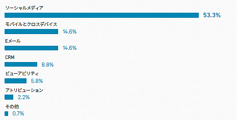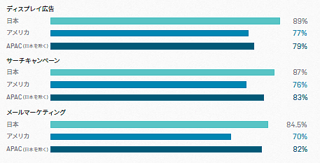 これは、プログラマティック広告での使用チャネル分析結果とも類似した結果隣となっており、日本はアメリカやAPACと比較しても「ソーシャルメディア」に着目しているマーケターが多い結果となっています。