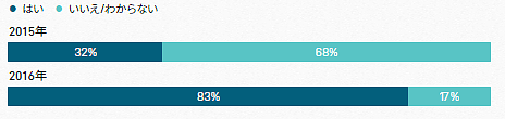 日本でも広告予算の50%以上をプログラマティック広告に充てていると回答したマーケターは1年で約3倍に増えました。そして最大の驚きは、下記のグラフを見てもわかる通り、2015年は74%が「プログラマティック広告ではない / わからない」と回答しているのに対し、2016年はすべてのマーケターがなんらかの形でプログラマティック広告に予算を割り当てていることが明らかになった点かもしれません。