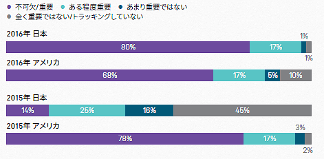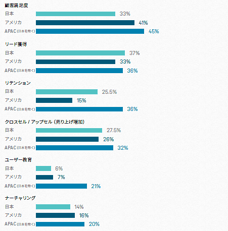 さらに、これまで世界とは少し異なるトレンドを見せていた日本のマーケティングトレンドが、本調査ではアメリカやAPACのマーケティングトレンドと相似を見せ初めています。下記の調査結果もその一つで、今年は日本の結果もアメリカに類似していることが見て取れます。