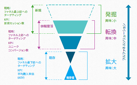 どちらをターゲットとするかによって、設定すべきKPIは変わってきます。その異なるKPIを別々のマーケティング活動で組み立てるのは大変ですが、「フルファネルマーケティング」の手法を使って購買ファネルのどのステージにいるユーザーもアプローチが可能になります。