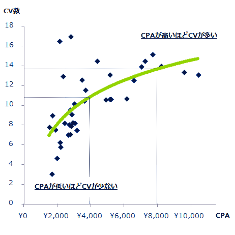 CPAが安価であればあるほど利益率は高まりますが、購入数が少なくなり、利益額が少なくなってしまうリスクもあります。そのため、目的(ここでは購入数)が最大化される最適なコスト(広告投下費用)をどう設定するかがポイントになります。