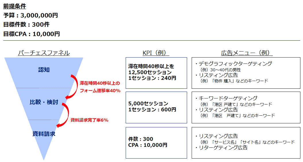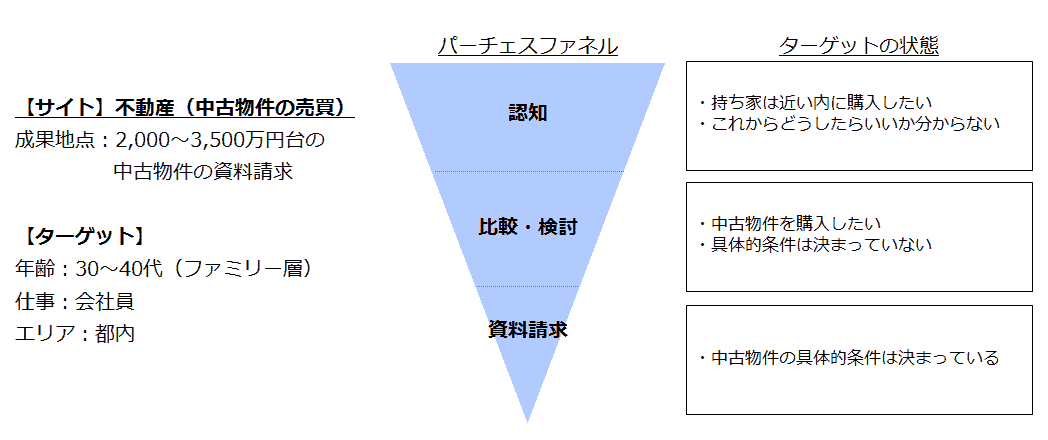 不動産を売りたいという企業の目的からターゲットユーザーを整理していきます。この図は認知から資料請求までの流れを表した、典型的なパーチェスファネル(購買プロセス)の例です。