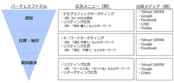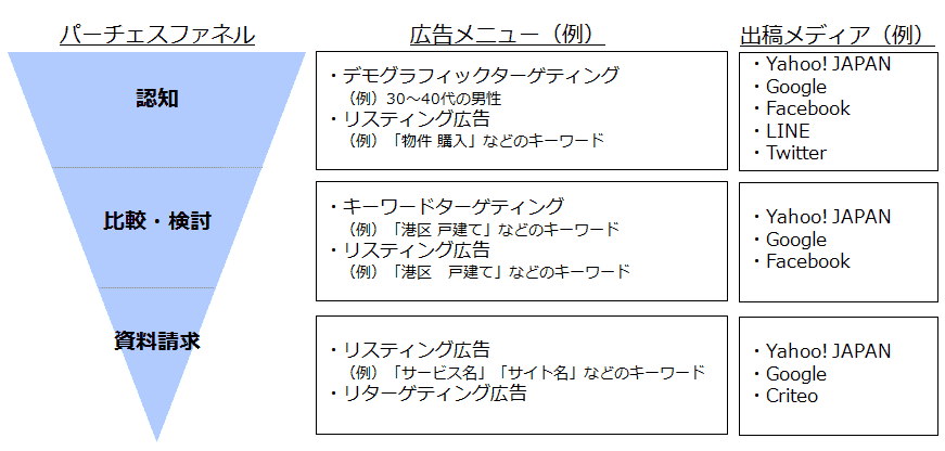 目的・業種・ターゲットなど、さまざまな要因があるため広告メニューの選定に正解はありませんが、購買プロセスごとにリーチしやすい広告メニューがあります。まず、ここから選定するのがスムーズでしょう。