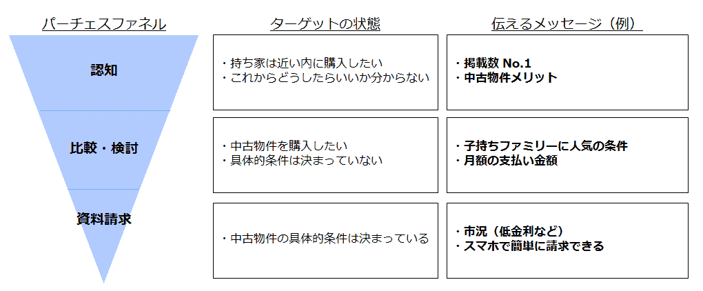 ターゲットとメッセージの考え方は、不動産以外の業種であっても基本は同じですが、訴求する商品の単価や購入までの検討期間によって変えていく必要があります。
