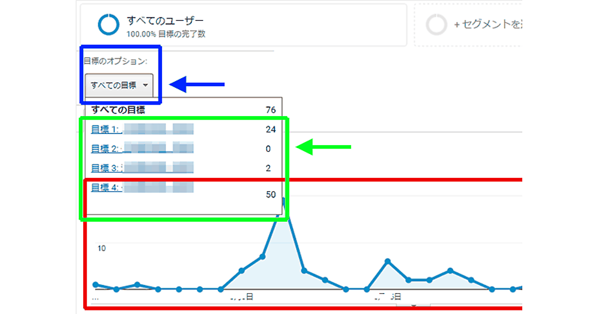 また、複数の目標を設定している場合は、特定の目標だけに絞り込んで見ることもできる。それには、左上にある「目標のオプション」と書かれた部分にあるプルダウンを利用する(図2青枠部分)。標準では「すべての目標」が選択されているが、このプルダウンをクリックすると各目標を選択できる(図2緑枠部分)。