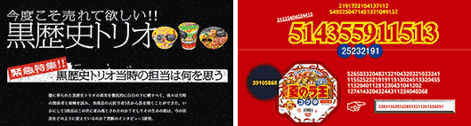 「今度こそ売れて欲しい!! 黒歴史トリオ」といった、攻めすぎて自滅してしまった商品を逆手にとってPRしてみたり、日清ラ王のサイトを数字の羅列で作って「ラ王のサイトがバグった!」とPRしてみたり。
