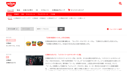 リニューアル後のニュース(プレスリリースなど)は、商品、事業会社に関係なく時系列に並んでいます。このサイトを見れば日清食品グループの社外向けの情報がすべてわかります。