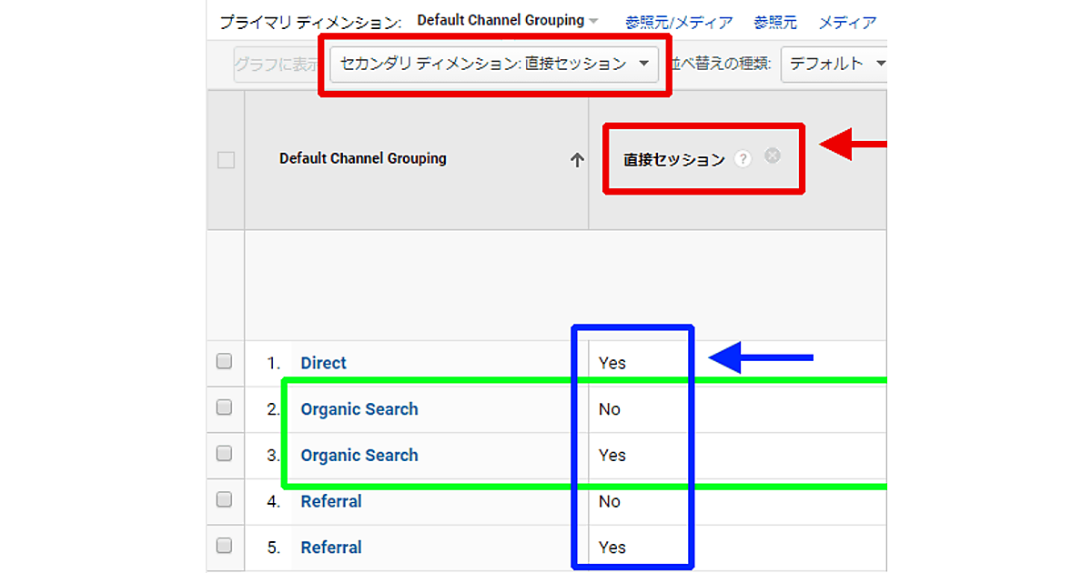 図1と図2の例でいえば、図1の「Organic Search」(検索エンジン)には9セッション(図1黒枠部分)表示されていたが「そのうち8セッションが実際のリファラーも検索エンジン(直接セッション=No)で、残りの1セッションは実際はノーリファラーだった(直接セッション=Yes)」ということになる(図2緑枠部分)。