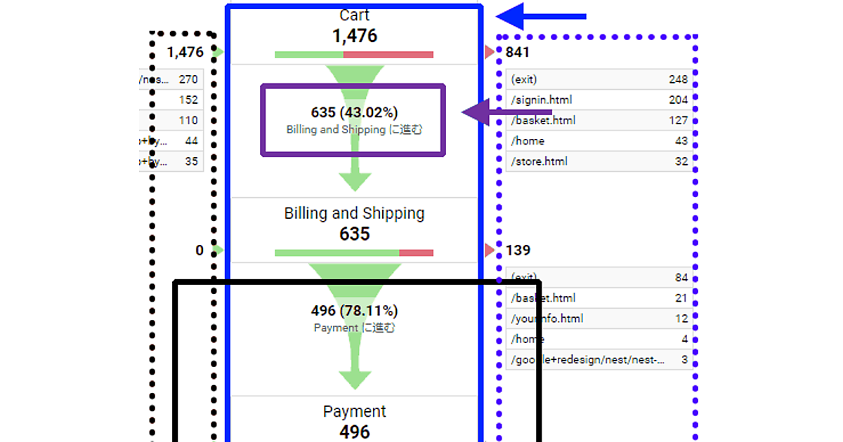 このレポートをどうサイトの改修に役立てればいいのだろうか? 「ボトルネックのページはどこか」と「離脱してどこに行ったのか」という2つの視点で見ていこう。
