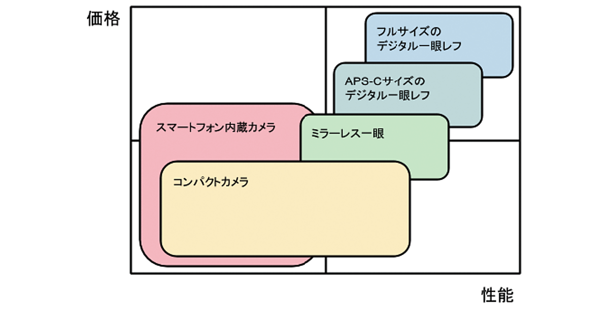 デジタルカメラにおけるスマートフォン内蔵カメラの位置づけ。最近では高解像度な写真が撮影できる機種も多いが、写真撮影に特化した製品ではないこと、イメージセンサーサイズが小さいことから、性能や画質はデジタルカメラに及ばないといえる。