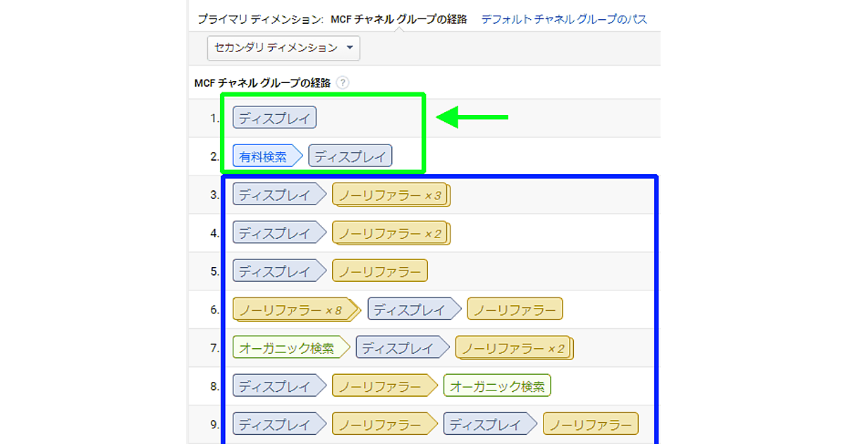 ディメンション名は「MCFチャネル グループの経路」(図4緑枠部分)となっている。これは、「MCFチャネル グループ」という分類単位の訪問履歴を見られるいうことだ。「MCFチャネル グループ」についてはこの記事の最後で後述するが、[集客]セクションの「デフォルト チャネル グループ」(連載の第29回を参照)と同様に、訪問を大ざっぱに見るための分類だと考えてほしい。