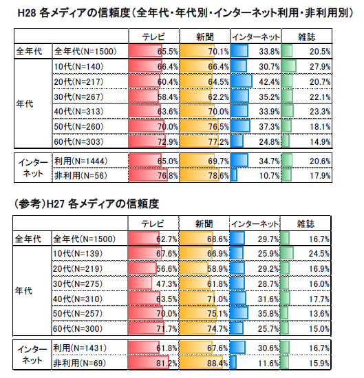 全年代で見ると、最も信頼度が高かったのは新聞であり、70.1%(前回平成27年調査68.6%)。次いでテレビが65.5%(同62.7%)、インターネットが33.8%(同29.7%)、雑誌が20.5%(同16.7%)。