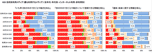 「いち早く世の中のできごとや動きを知る」及び「世の中のできごとや動きについて信頼できる情報を得る」ためには、全年代でテレビが最も高い割合で利用されている。一方で、「趣味や娯楽に関する情報を得る」ため等では、インターネットが最も高い割合で利用されている。この順位は平成24年調査から変わっていない。