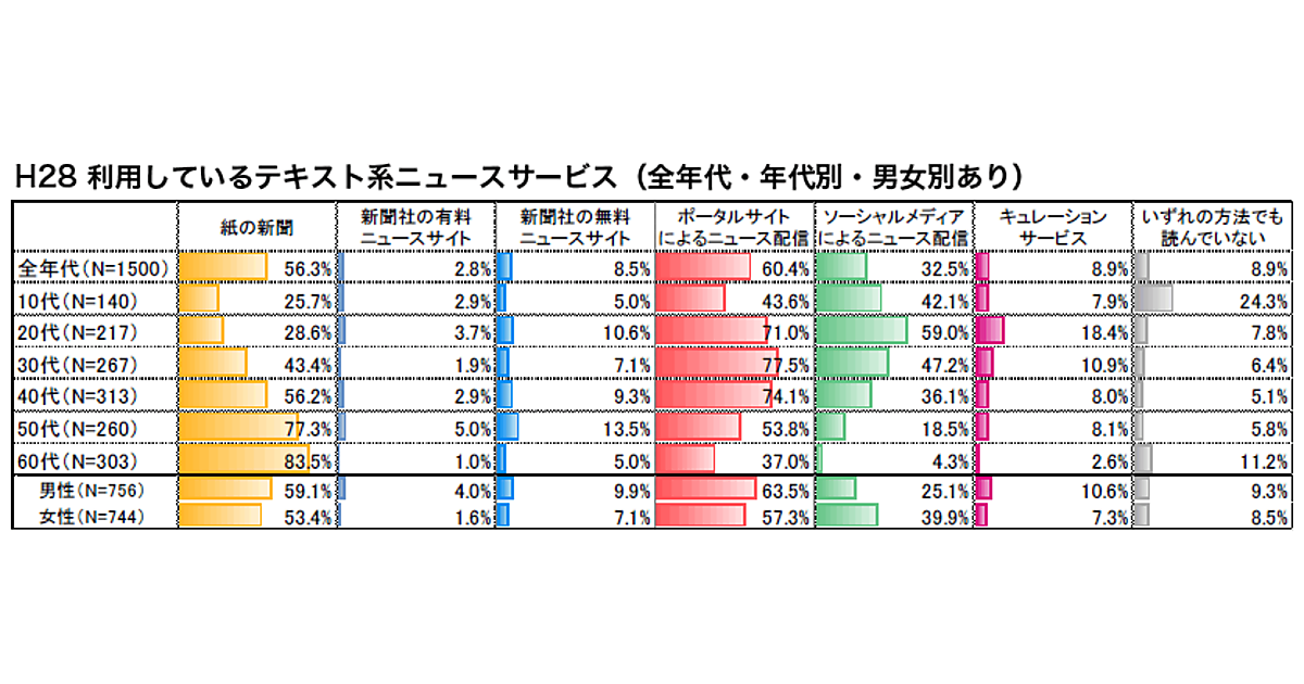 新聞及びニュースサイトなどからテキストでニュースを得る手段について、全年代で見ると、紙媒体の新聞の割合が61.5%→56.3%と減少し、Yahoo!ニュースなどのポータルサイトのニュース配信が59.1%→60.4%と増加した。本調査開始以降初めて、ポータルサイトによるニュース配信の利用率が最も高くなった。