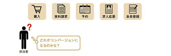 コンバージョンというと、たいていは「購入」がすぐ頭に思い浮かぶでしょう。そのほかにも会員やメールマガジンなどの「登録」、予約や来店あるいは資料請求といった「申し込み」、キャンペーンやなどの「応募」、場合によってはソーシャルメディア上での「シェア」といった行動もサイトによってはコンバージョンとされています。