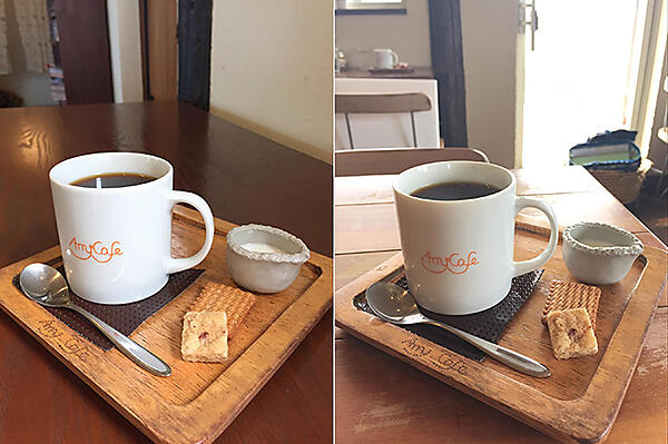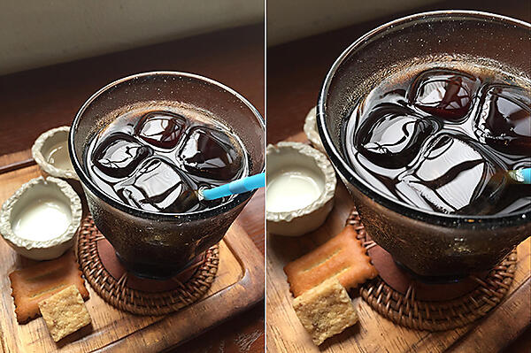 逆光で撮影したアイスコーヒー 左:引きで撮影 右:寄りで撮影