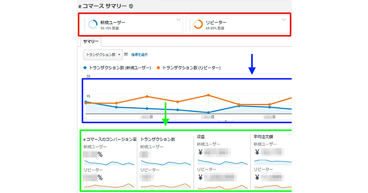 見る指標は「新規セッション率」や「新規ユーザー」(図5赤枠部分)とeコマース系の指標(図5青枠部分)だ。