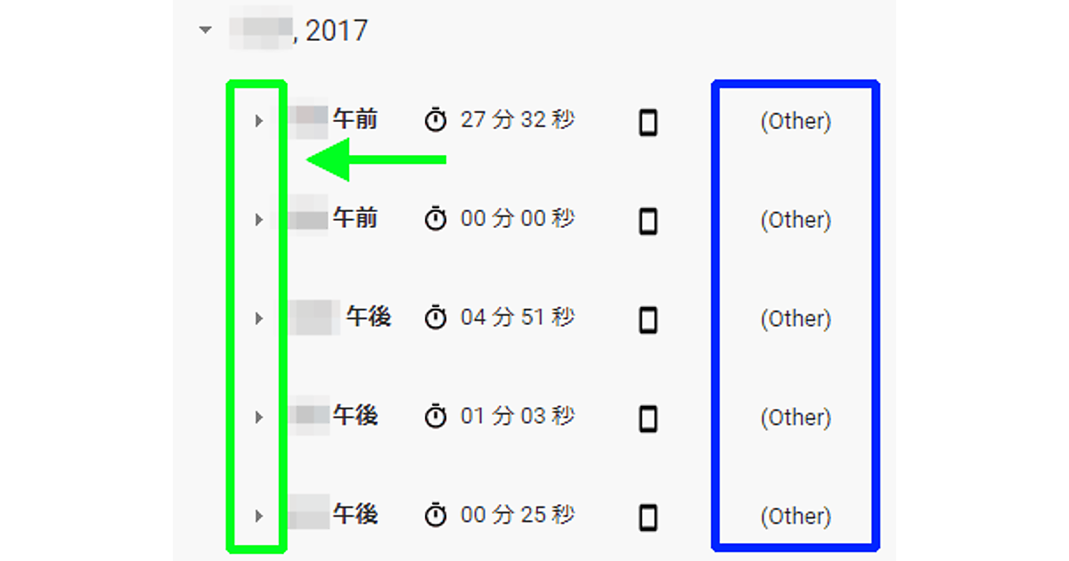 トランザクションのあったセッションはもちろんのこと、「その前後でユーザーがどのような集客チャネルから訪問したのか」は、中央の列(図10青枠部分)で確認できる。各セッションの閲覧ページなどの明細が見たければ、左の三角印(図10緑枠部分)をクリックすればよい。
