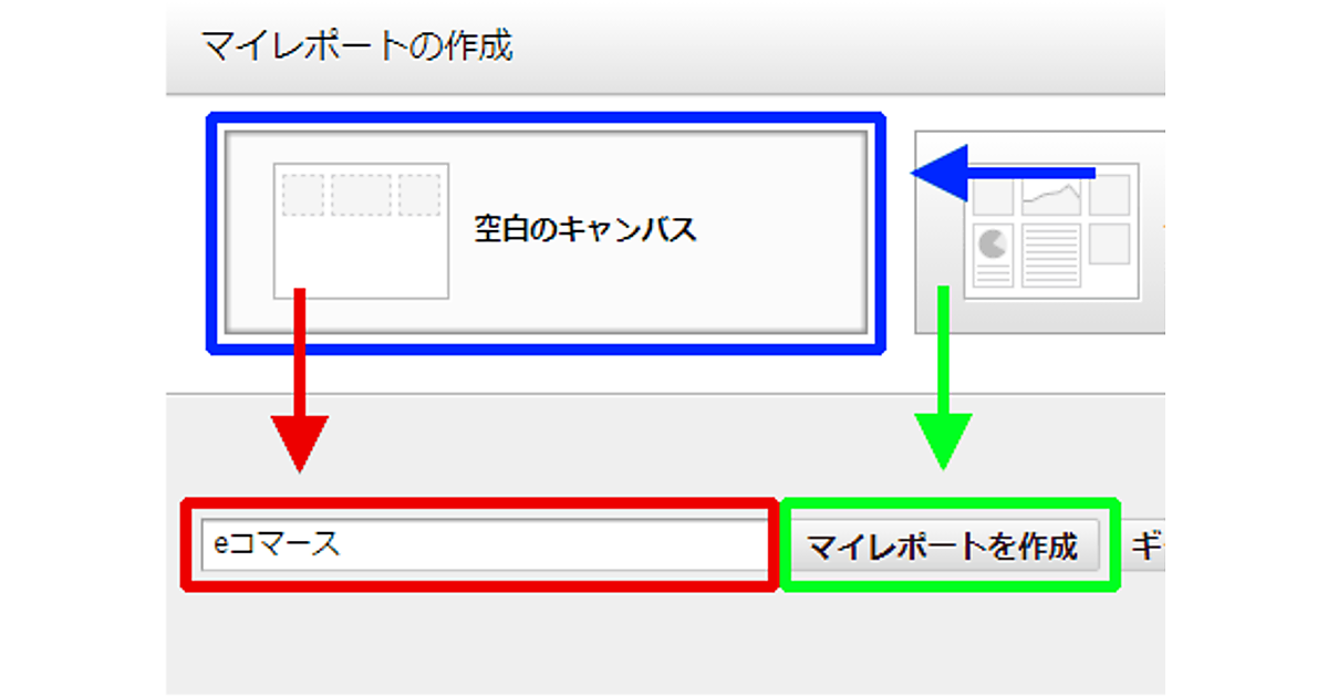 すると図2のような画面が表示される。適切にマイレポートの名前を入力し(図2赤枠部分)、「空白のキャンバス」(図2青枠部分)をクリックして「マイレポートを作成」ボタン(図2緑枠部分)をクリックする。